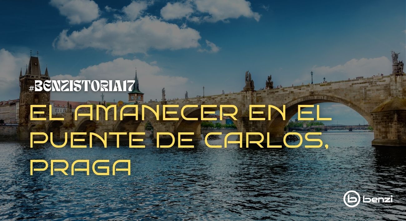 Las estatuas aparecen como sombras oscuras contra el cielo que empieza a cambiar de color. El río Moldava corre despacio bajo los arcos del puente. A lo lejos, el castillo de Praga se recorta sobre la colina todavía envuelta en una luz suave.